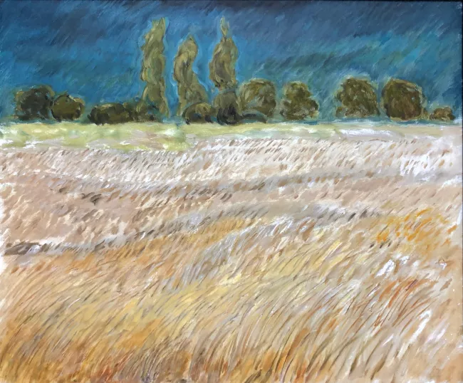 Champ d'herbes jaunes sous un ciel d'orage