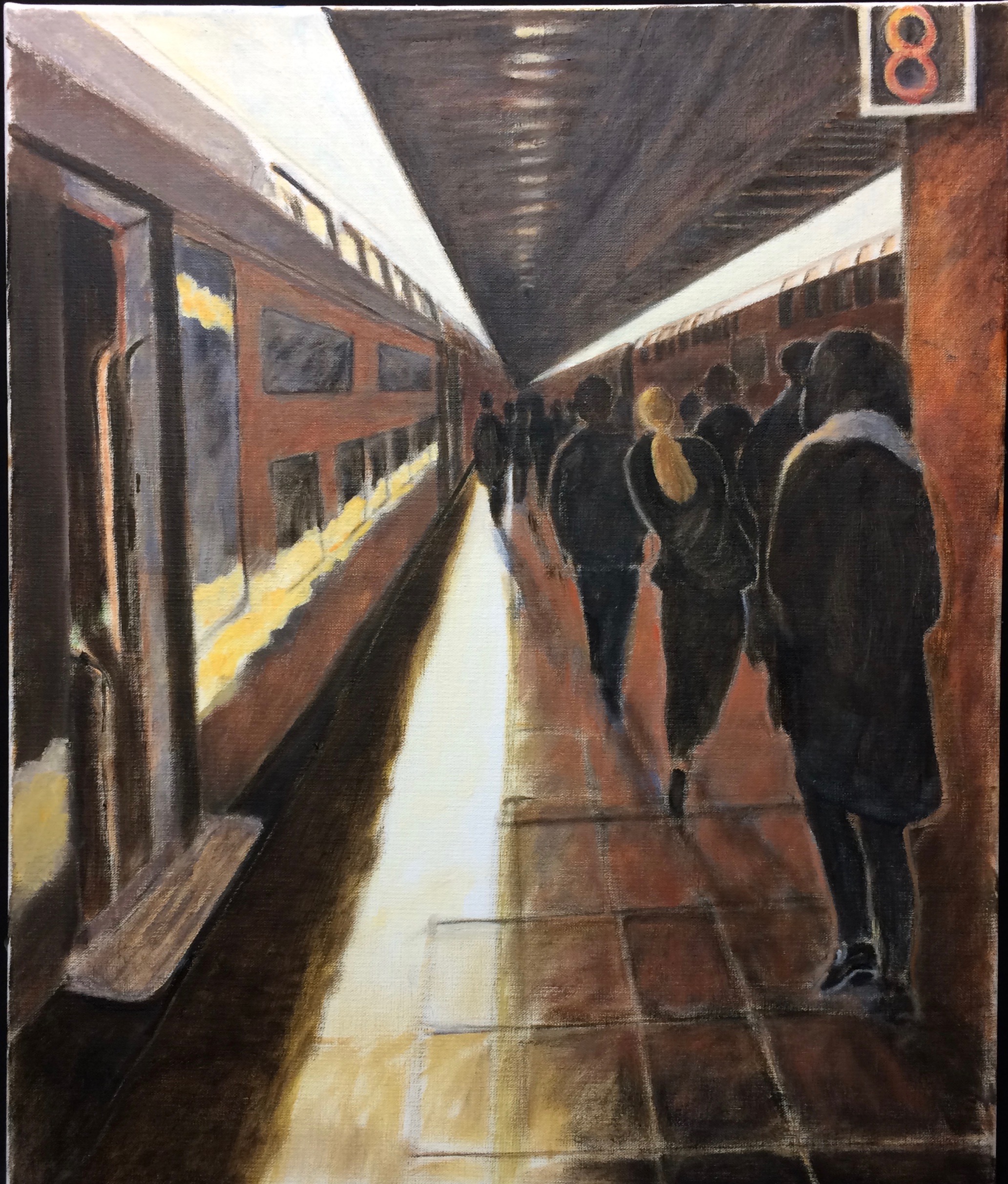 Descente des voyageurs à l'arrivée des trains. Date août 2017 identifiant 244 Dimension 54X65 Inspiration En sortant du train j'ai tout de suite repéré ces trois traits de lumière qui font comme une hélice, je n'avais plus qu'à sortir l'Iphone.