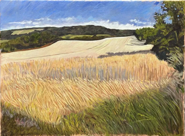 j'avais déjà fait une toile du même sujet avec les blé coupés. Dans ce chemin qui part du lavoir des 9 Fontaines : un sujet de toile tous les dix mètres... Date juin 2022 identifiant 492 Dimension 61x45,5