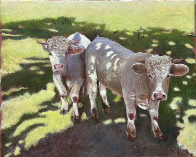 Date décembre 2023 identifiant 560 Dimension 46x37,5 Inspiration Le risque de m'approcher de ces deux taurillons n'était pas grand. A cet âge là ils sont encore paisibles, mais ils peuvent jouer à la poussette...