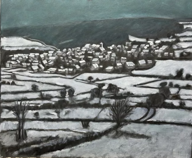 J'ai souvent retenu cette vue de Fley. Il manquait le village sous la neige. Date février 2024 identifiant 570 Dimension 55x46