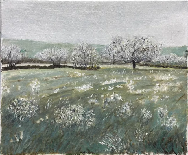 Date février 2025 identifiant 615 Dimension 55x46 Inspiration J'ai du mal avec le givre, je me suis imposé ça comme exercice.