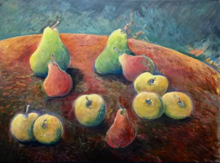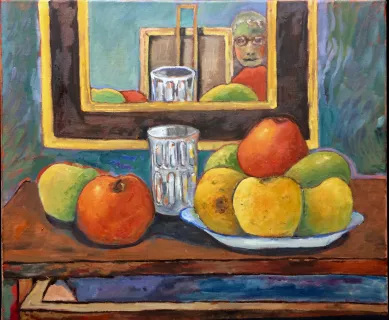 | D'après une nature morte de Cézanne ( mais ici le "copiste" se regarde dans la glace) |
