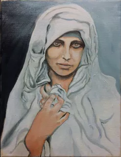 | Visage de femme encadré par le drapé d'un châle blanc (inspiration Mucha) |