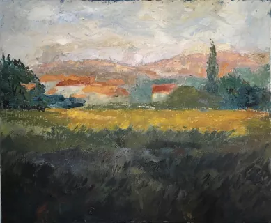 | D'après une toile de Monet "Une meule près de Giverny : Meule, champ et vieilles maisons " |