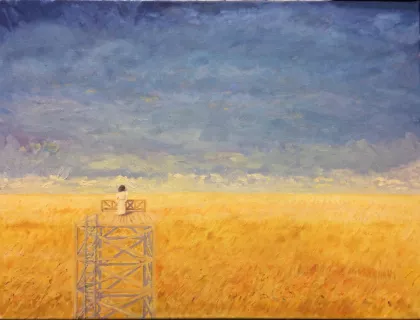 | Femme sur un mirador devant un champ de blé |