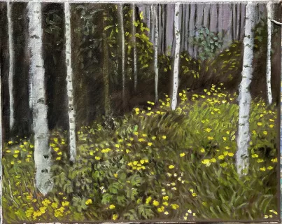 Troncs de bouleaux et renoncules, Parc Minier 41x32,5 533